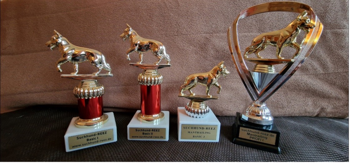 Schleichend trainiere ich mit Aiko schrittweise auch die Anforderungen für die Prüfung Profi III. Bei dieser Prüfung müssen dann Gegenstände von Gesuchter- und Verleitperson unterschieden werden, welche auf der Strecke ausgelegt sind. Am Ende muss der Hund unter mehreren Personen die gesuchte sicher anzeigen.