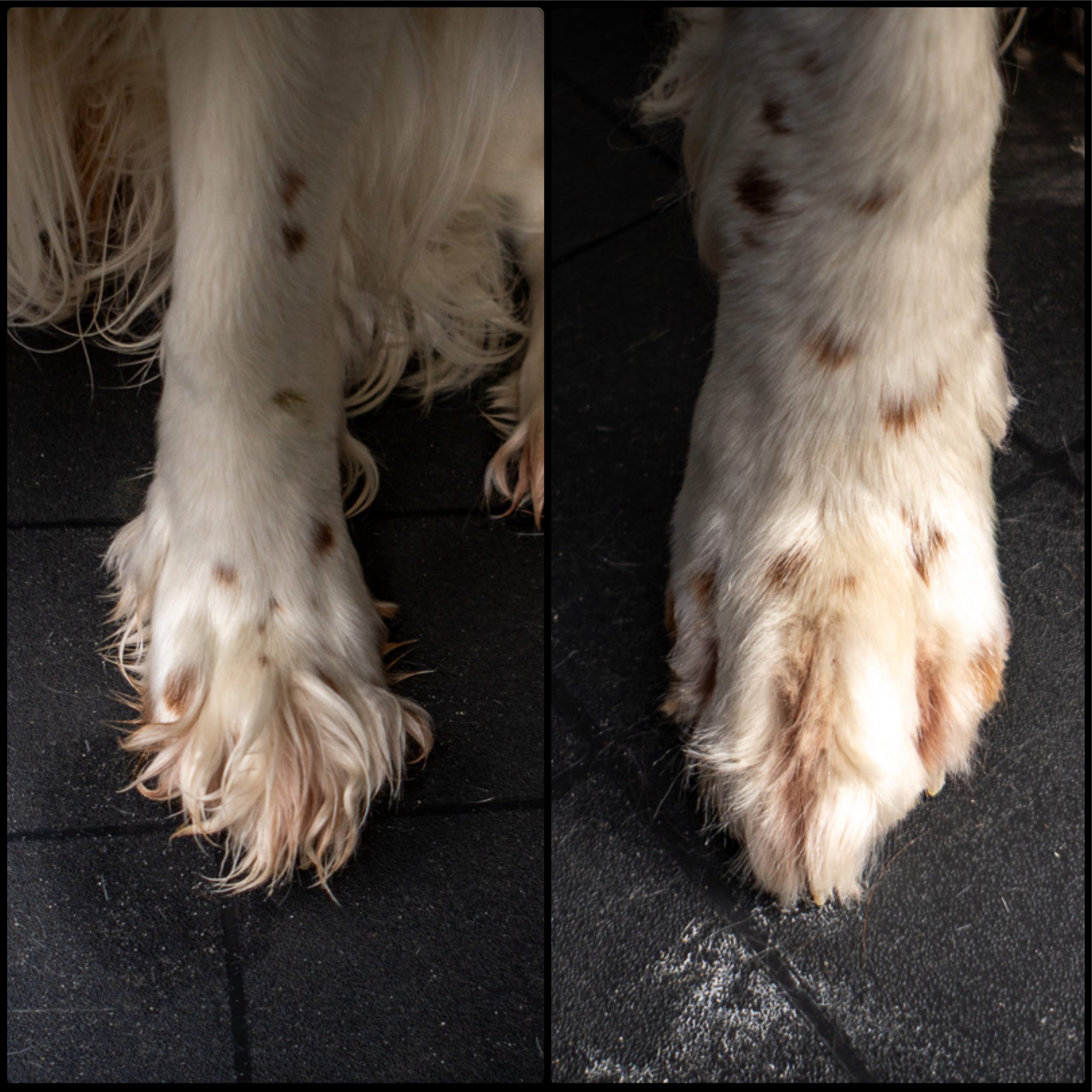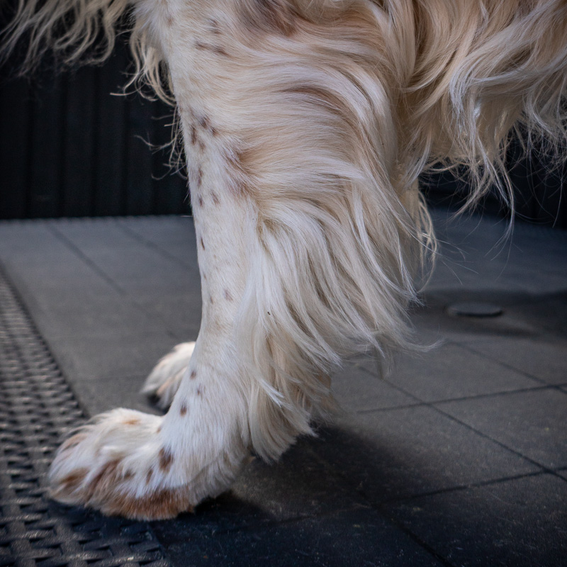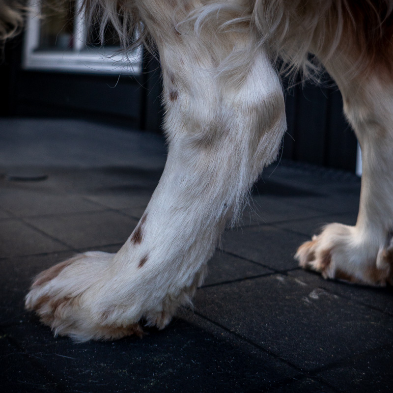 Wir schneiden das Fell sowohl oben auf den Pfoten als auch unten zwischen den Ballen – jedoch nur soviel, dass eine geschlossene Pfote bleibt. Das verhindert, dass der Hund rutscht oder sich unnötig viel Dreck im Fell festsetzt. Und wenn wir schon dabei sind, werden die Krallen kontrolliert und bei Bedarf gekürzt.
