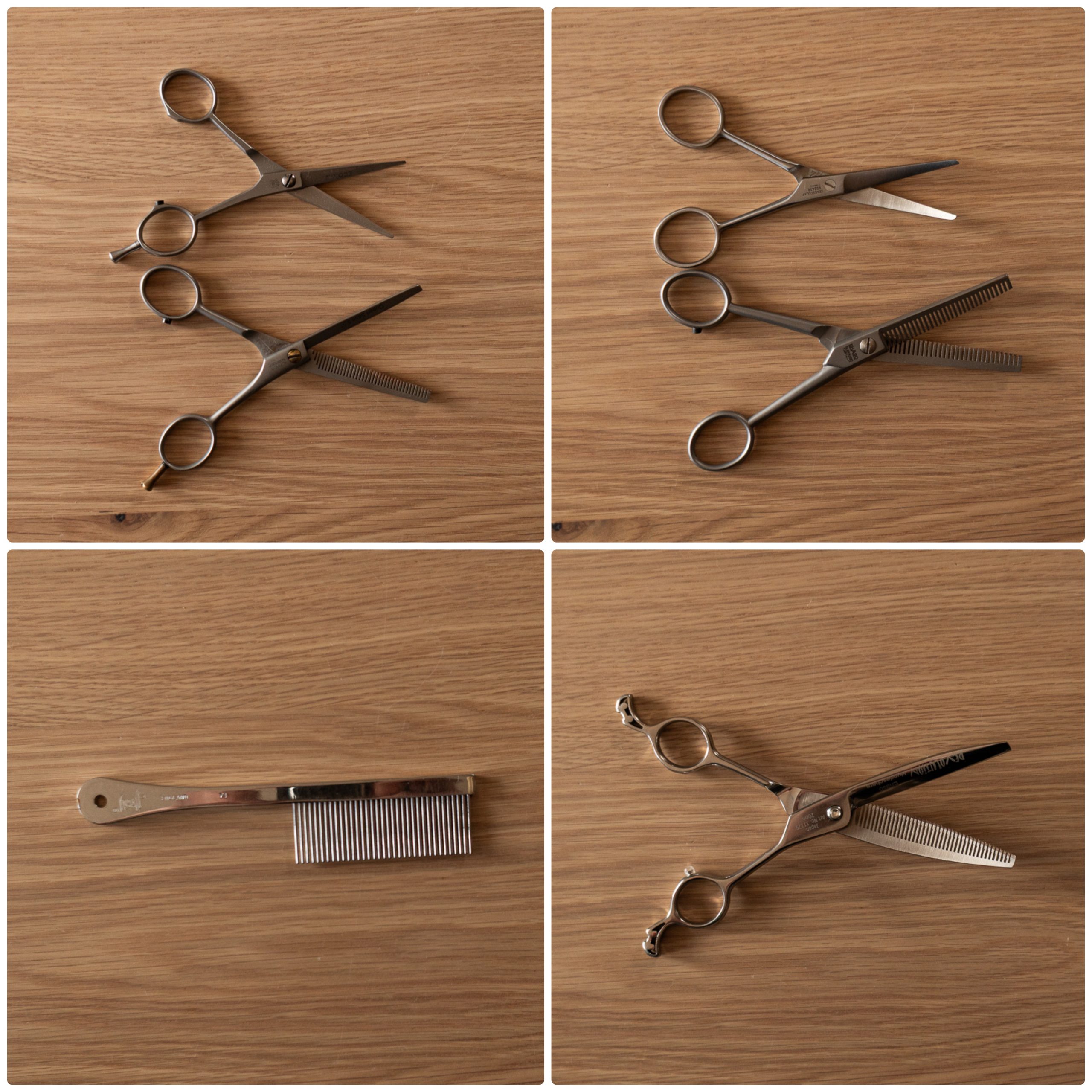 Wir haben unseren Werkzeugkoffer nach und nach erweitert. Sehr hilfreich ist eine abgerundete Schere für die Konturen an den Ohren und Pfoten. Eine doppelseitige Effilierschere nutzen wir gerne, um das Fell an den Ohren und den Fahnen ganz sanft auszudünnen, ohne dass es abgeschnitten aussieht. Das funktioniert auch mit der einseitigen Effilierschere – sie haut aber schnell mal eine Ecke ins Fell.