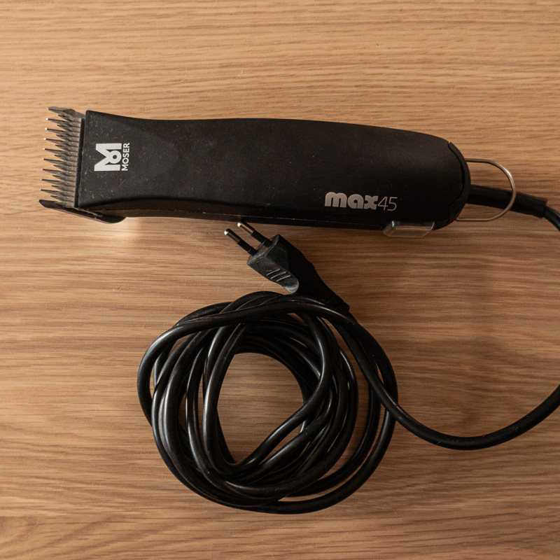 Mit der Maschine sind Ohren, Hals und Brust schnell erledigt. Es geht viel leichter als ein Scherenschnitt. Wir nutzen hierfür die Moser max45 in Kombination mit einem Andis Scherkopf Nr. 7 (3.2mm). Trotz Training ab dem Welpenalter, lassen es sich bei uns aber nur zwei von vier Hunden gefallen. Den Anderen ist das Brummen der Maschine einfach zu gruselig.