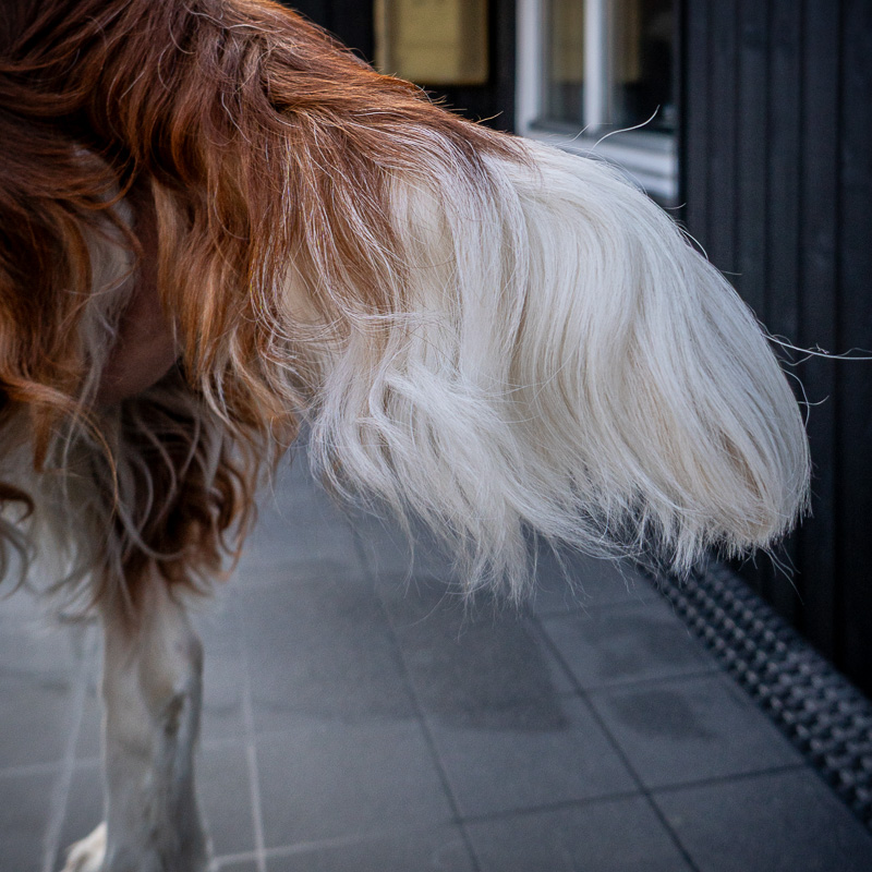 Wir ertasten die Spitze der Rute und kürzen überstehendes Fell. Die Fahnen an der Unterseite der Rute leicht kürzen, je nach persönlichem Geschmack. Uns gefällt eine buschig dichte Rute am besten.